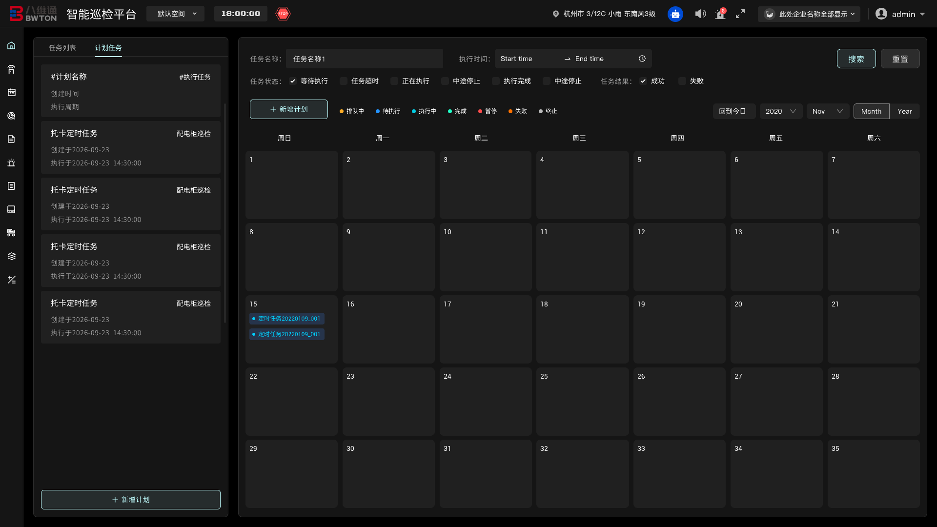 任務自動化是實現(xiàn)無人化作業(yè)的關鍵。通過將巡檢策略封裝為可復用的“任務模板”,并綁定到可視化的“任務計劃”日歷中。實現(xiàn)“一次配置,長期自動執(zhí)行”的目標。系統(tǒng)會根據(jù)預設的周期和規(guī)則,自動喚醒、調度載具完成巡檢。